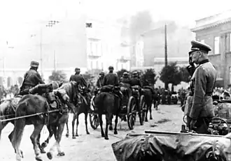 On September 5, German troops smashed both wings of the Łódź Army during the Battle of Łódź and opened their way to the city. The previous day, wealthier residents began to leave the city. During the night of 5th to 6th of September, military and state authorities - headed by voivode Henryk Józefski and starosta Henryk Mostowski, self-government with president Jan Kwapiński and the police left the city as well, and on the night of 4–5 September the evacuation of offices and institutions began a process which lasted until noon on September 6. The city was deprived of all means of transport. Emergency services and fire brigade equipment were also taken away. At the same time, the inhabitants fled from Łódź en masse, following the Brzeziny road to Warsaw. German aircraft fired on evacuating civilians, causing casualties among defenseless refugees.[23] Bishops Włodzimierz Jasiński and Kazimierz Tomczak announced they would stay behind to support the city's population. That day, Major Kazimierz Kowalski formed an underground resistance cell, with members including Captain Bolesław Balcerzak, scoutmaster Mieczysław Łętowski, former Mayor Aleksy Rżewski, Fabian Urbaniak and Janina Żyźniewska. The group laid the foundation for the Service for Poland's Victory in Łódź.[24][25]