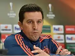 Josip Kuže parted ways with Albania three years and a half after he started the job, and in December 2011, Italian coach Gianni De Biasi replaced him.[39] Albania started the qualifiers well, notably defeating Cyprus with 3–1 by goals from Armando Sadiku, Edgar Çani and Erjon Bogdani as well as beating Slovenia at home with 1–0 by a goal from Odise Roshi.[40] which was followed by an unprecedent away win at Norway in Oslo after a stunning goal from Hamdi Salihi.[41][42] Albania would also draw against Norway at home despite leading the match with a goal from Valdet Rama, this match ending in a 1–1 draw.[43] The team was at one point 2nd with 6 matches played and 4 to spare, but failed to be successful in the last four, losing away in Slovenia and Iceland,[44][45] as well at home against Switzerland,[46] and drawing in Cyprus.[47] With De Biasi, the Albania national team reached an unprecedented high number of players, who although are ethnically Albanian, were not born in Albania, but either in Kosovo, or outside of Kosovo, while hailing from Kosovo Albania parents. In 2011–13, 14 Albanians of Kosovo origin were either part of the start-up team, or had received recent call-ups.[48]