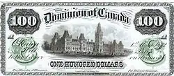 In 1871, the federal government issued notes for five hundred dollars and one thousand dollars, featuring Queen Victoria on the five-hundred-dollar note and an allegorical female figure with the arms of Canada on the one thousand-dollar note.[65] In 1872, the government issued a fifty-dollar note, featuring Mercury, the Roman god of commerce, and a one-hundred-dollar note, featuring the Centre Block of the Parliament buildings.[65] A two-dollar note was issued in 1878, featuring the Governor General, the Earl of Dufferin. This was followed in 1882 by a four-dollar note featuring the then Governor general, the Marquess of Lorne.[66]
