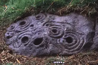 As attested by many instances of rock art, the Northumberland region has a rich prehistory. Archeologists have studied a Mesolithic structure at Howick, which dates to 7500 BC and was identified as Britain's oldest house until it lost this title in 2010 when the discovery of the even older Star Carr house in North Yorkshire was announced, which dates to 8770 BC. They have also found tools, ornaments, building structures and cairns dating to the bronze and iron ages, when the area was occupied by Brythonic Celtic peoples who had migrated from continental Europe, most likely the Votadini whose territory stretched from Edinburgh and the Firth of Forth to Northumberland. It is not clear where the boundary between the Votadini and the other large tribe, the Brigantes, was, although it probably frequently shifted as a result of wars and as smaller tribes and communities changed allegiances. Unlike neighbouring tribes, Votadini farms were surrounded by large walls, banks and ditches and the people made offerings of fine metal objects, but never wore massive armlets. There are also at least three very large hillforts in their territory (Yeavering Bell, Eildon Hill and Traprain Law, the latter two now in Scotland), each was located on the top of a prominent hill or mountain. The hillforts may have been used for over a thousand years by this time as places of refuge and as places for meetings for political and religious ceremonies.[4] Duddo Five Stones in North Northumberland and the Goatstones near Hadrian's Wall are stone circles dating from the Bronze Age.[5]