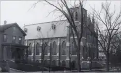 The number and devotion of the first parishioners permitted a church to be constructed within 10 years.[20] In 1856 the cornerstone was laid, and in 1857, the first St. Mary's Church was completed on Washington Street between Spruce and Marion Streets.[3][4][8][21][20][9] It could seat 700 people.[9]