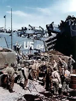 The development of amphibious craft allowed the Allies to land in Normandy without having to quickly seize a heavily defended port.[153][154] After their victory in the Battle of Normandy, the advance came to a halt in September 1944.[155] This was not a result of inadequate supplies or port capacity – there were still some 600,000 long tons (610,000 t) of supplies stockpiled in the Normandy lodgment area in November – nor solely by a shortage of fuel. Rather, the problem was the inability to deliver fuel and supplies to the armies.[156] Railways could not be repaired and pipelines could not be constructed quickly enough.[157] Motor transport was used as a stopgap,[158] but insufficient numbers of heavy trucks compelled the Army to use the smaller general purpose 2½-ton 6×6 trucks for long hauls, for which they were unsuited.[159] The Red Ball Express was a success, but at a cost: overloading, careless driving, lack of proper vehicle maintenance, and wear and tear took their toll on the truck fleet.[160][161] In the long run it was the railways that carried most of the tonnage.[162]