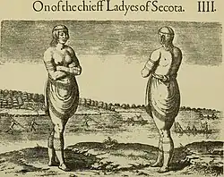 Early explorers to North America made many ethnographic observations about the Indigenous people they met. Initially, they did not have a word for tattooing and instead described the skin modifications as "pounce, prick, list, mark, and raze" to "stamp, paint, burn, and embroider".[34]: 3 In 1585–1586, Thomas Harriot, who was part of the Grenville Expedition, was responsible for making observations about Indigenous People of North America.[35] In A Brief and True Report of the New Found Land of Virginia, Harriot recorded that some Indigenous people had their skin dyed and coloured.[35]: 11 John White provided visual representations of Indigenous people in the form of drawings and paintings.[35]: 46–81 Harriot and White also provided information highlighting specific markings seen on Indigenous chiefs during that time.[35]: 74 In 1623, Gabriel Sagard was a missionary who described seeing men and women with tattoos on their skin.[36]: 145