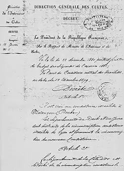 In 1808, a centralized Jewish organization, the Central Consistory, was created by imperial decree along with regional consistories; the different communities were required to adhere to it.[1] Besançon was first attached to Nancy in 1810 and had to pay its membership with a contribution of 42,470 francs.[22][2] A decree of August 24, 1857 connected the community of Besançon to the consistory of Lyon[23] without this time needing to spend funds.[2] Another imperial decree of August 1, 1864 authorized the creation of a rabbinical seat in Besançon.[2] Shortly after, Jacques Auscher, former rabbi of Saint-Étienne became the first Grand Rabbi of the city.[2] In February 1870, he sent a letter to the prefect of Doubs, asking for the creation of a consistory for the departments of Doubs and Jura, detached from the consistory of Lyon to which the two departments were then attached.[19] He wrote: "The expediency of our request is based first of all on the precise texts of the organic law of our worship, a law which declares obligatory the erection of a Consistory where a group of 2,000 Israelites can be gathered, that is to say in a single department, or in several contiguous departments. Besançon already has an important community, schools, Benevolent Societies, a beautiful Temple, new and rich, erected thanks to the sacrifices of the community."[19]