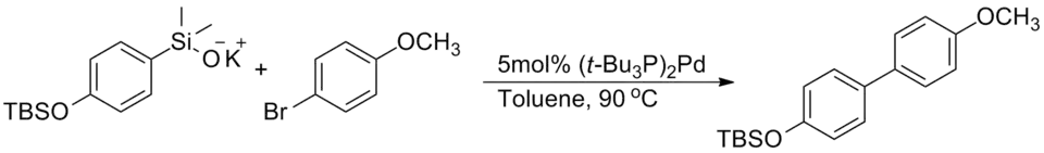 20. ^ a b Denmark, S. E.; Smith, R. C.; Chang, W.-T. T.; Muhuhi, J. M. (2009), "Cross-Coupling Reactions of Aromatic and Heteroaromatic Silanolates with Aromatic and Heteroaromatic Halides", Journal of the American Chemical Society, 131 (8): 3104–3118, Bibcode:2009JAChS.131.3104D, doi:10.1021/ja8091449, PMC 2765516, PMID 19199785