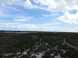 In the late 18th and early 19th centuries the site was largely devoid of vegetation, except for bits of scrub. Later ecological succession filled in the gaps over time, such that the site's toponyms were transferred to a similar locale farther south by the 1840s.[2] During World War II Camp Murphy occupied land at or near the site;[8] the name Hobe Mountain dates to this time.[9] Following the creation of Jonathan Dickinson State Park, a ranger tower was erected on the hilltop, drawing visitors.[10] Today a 27-foot (8.2 m) observation platform stands on the site, affording a panoramic view of its environs, including the Atlantic Ocean and the Intracoastal Waterway.[3]