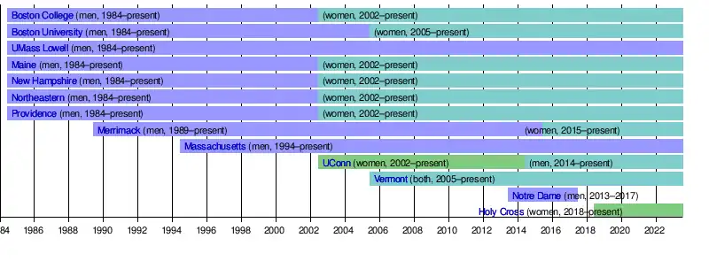 Hockey East came into existence in 1984 for men's hockey when most of its current members split from what is today known as ECAC Hockey, after disagreements with the Ivy League members.[2] The women's league began play in 2002.[3][4]