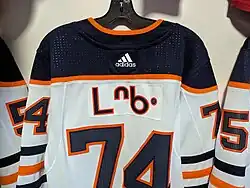 The design is often adapted for specific cases, such as former NHL Vancouver Canucks teammates Henrik and Daniel Sedin. Their last names are accompanied by their first initials, since being twin brothers they share the same last name on the same roster. Similarly, Aku and Aatu Räty wear jerseys with two letters from their first names when playing for the same team to distinguish them.[11] During an exhibition match between the Calgary Flames and Edmonton Oilers, defenseman Ethan Bear, who is of Cree descent, wore a jersey with his last name on it written in Cree syllabics.[12]