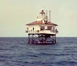 The lighthouse stood near the hulk of an old ship, the Hannibal, which was frequently used for target practice by Navy fighters. On February 19, 1957, three ADSN Skyraiders from the Naval Air Station at Atlantic City, New Jersey bombed the light; their pilots had mistaken the structure for the hulk of the Hannibal.[1] Three practice rockets hit the light. Although they carried no explosives, they still managed to tear holes in the roof and walls, and damaged several of the iron pilings as well. The keepers called the United States Coast Guard, which sent aid. Although the four men were evacuated, they returned the next day to begin repairs.