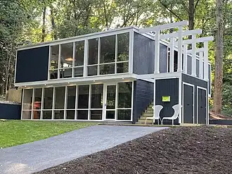 Principally designed by Charles M. Goodman and developed by Robert C. Davenport in the 1940s, it was one of the Washington, D.C. area's first post-war modernist architecture developments, combined with natural landscape designs between 1949 and 1971. Davenport purchased the original 225 acres (91 ha) of hilly, undeveloped land for $550/acre (present value:$8,869/acre). As home sales and national acclaim grew, he then acquired another 101 acres (41 ha) in 1956, and constructed more homes until the "New Hollin Hills" was completed in 1971. In all, roughly 450 houses with contemporary construction techniques and landscape plans were established in northern Virginia, offsetting the area's more common Colonial Revival homes.[4] Today, the neighborhood is known primarily for its mid-century modern architecture homes, each is uniquely oriented on its lot to maximize its privacy and landscape view, with sight lines intentionally chosen to enhance the common space shared by each structure. These design tenets have remained very cohesive because of a long-standing design review committee that advises on building or modification of existing houses, and starting in 2022, its designation as the Hollin Hills Historic Overlay District (HOD), which requires modifications and additions to be reviewed by Fairfax County Architectural Review Board.[3][5]