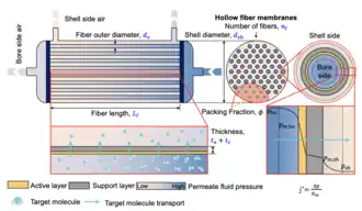 The properties of HFMs can be characterized using the same techniques commonly used for other types of membranes. The primary properties of interest for HFMs are average pore diameter and pore distribution, measurable via a technique known as porosimetry, a feature of several laboratory instruments used for measuring pore size.[7] Pore diameter can also be measured via a technique known as evapoporometry, in which evaporation of 2-propanol through the pores of a membrane is related to pore size via the Kelvin equation.[8][9] Depending on the diameters of pores in an HFM, scanning electron microscopy or transmission electron microscopy can be used to yield a qualitative perspective of pore size.