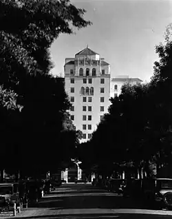 Hollywood Roosevelt Hotel was built in 1926, in what is known as the Golden Era of Los Angeles architecture, and was named after the 26th president of the United States, Theodore Roosevelt.[2] It was financed by a group that included Louis B. Mayer, Mary Pickford, Douglas Fairbanks, and Sid Grauman.[3][4] It cost $2.5 million ($45.3 million in 2024) to complete[4] and opened on May 15, 1927.[4]