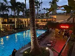 The hotel has a total of eight restaurants, bars and lounges.[4] 25 Degrees is a hamburger restaurant located just off the hotel lobby.[4] It was opened in 2005.[7] Public Kitchen & Bar features American food in an Old Hollywood-style dining room.[4] Tim Goodell is the head chef of both restaurants.[4] The Spare Room is a gaming parlor and cocktail lounge; the Library Bar is a cocktail bar with cocktails made using locally sourced ingredients; and Tropicana Bar overlooks the pool.[4][18] Beacher's Madhouse is a vaudeville-inspired theater owned and operated by Jeff Beacher.[4] Teddy's, a nightclub located off the lobby, was considered a celebrity haunt. It opened in 2005, was remodeled in 2012 and closed in 2015.[4][18]