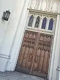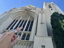 The church building was designed by Thomas P. Barber, and based in part on the English Gothic style of Westminster Hall in London.[11] The structure is steel-framed concrete, which makes it relatively earthquake resistant, and was realized with the contribution of the Italian structural engineer Francesco (Ciccio) Sabato Ceraldi. The church is also an example of American Gothic architecture with its sanctuary roof having an open hammer beam construction.[12]