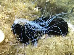 Adult black sea cucumbers are normally either male or female. The gonads take a long time to mature and gametes are released synchronously into the water column in early spring, probably as a result of a rise in water temperatures.[7] The larvae become part of the zooplankton. After several moults they grow tentacles and settle out onto the sea floor. Juveniles are seldom seen so it is surmised that they live by day in crevices and under rocks for protection from predators whereas the adults take no particular care to remain hidden.[6]