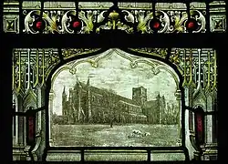 Window in St Peter's church, Holwell depicting St Albans Cathedral
