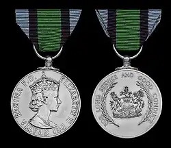 The Hong Kong Disciplined Services Medal was a long service medal awarded to members of the Hong Kong Disciplined Services in British Hong Kong. Established by a Royal Warrant on 8 July 1986, the award of the medal was intended to replace the awarding of the Imperial Service Medal.[2] This medal was replaced by both the Hong Kong Customs & Excise Long Service Medal and the Hong Kong Immigration Service Long Service Medal, for long service to members of the respective disciplined services, upon the transfer of sovereignty in 1997, however the same ribbon continues to be used for the Hong Kong Immigration Service Long Service Medal.