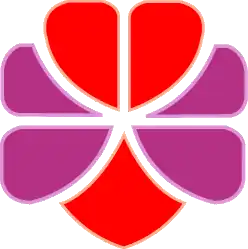 The association's symbol is a stylized trefoil. The notched edges and the mauve colour recall the symbol flower of Hong Kong, the Bauhinia blakeana, while the colour red is seen as particularly auspicious. The internal division of the trefoil shows the Chinese character Kwong meaning a ray of light from a beacon, reflecting the spirit of the Guide movement.[1]