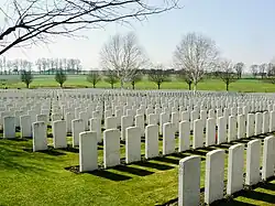 Hooge Crater Cemetery is a Commonwealth War Graves Commission burial ground for the dead of the First World War located in the Ypres Salient in Belgium on the Western Front. Hooge Crater Cemetery is named after a mine crater blown nearby in 1915 (since filled in, see below) and located near the centre of Hooge, opposite the "Hooge Crater Museum" (founded in 1994)[2] and separated from it by the Menin Road. Hooge itself is a small village on the Bellewaerde Ridge, about 4 kilometres east of Ypres in the Flemish province of West Flanders.
