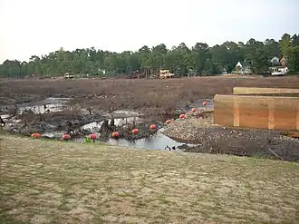 In late May 2003, over Memorial Day weekend, heavy rains caused the embankment dam to give way and also destroyed 30 feet (9.1 m) of the nearby Lakeview Road.[4] About 40 homes and 1600 people downstream were evacuated as water from Hope Mills Lake rushed down the creek causing $2.1 million in damages before making its way to the Cape Fear River. One of the floodgates on the dam had failed to open because of the pressure exerted by the flood waters, which helped push water over the top of the dam.[5] Later in 2003, Lakeview Road was repaired and plans for the repair of the dam were underway. After four years of fund and permit requests, construction on the new 14 million dollar Hope Mills Dam began in March 2007.[6] Crowder Construction Company was awarded the contract to construct the dam along with designs from Mactec, Morrison Engineers. The new dam would essentially be a concrete labyrinth-spillway that would expand the dam's ability to discharge flood waters. The new dam would be 600 feet (180 m) longer and would incorporate a fish ladder as well.[7][8] Construction of the new Hope Mills Dam was complete in June 2008 and the lake was again full by August.[8][9]