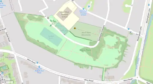 There are five entrance gates to Horn Park.[14] The southern entrance gate from Winn Road, joins a foot path between two houses of Winn Road before coming to the main field of the park.[15][16][8] The northwest corner of Horn Park has a footpath passing through a gate to Gavestone Road,[17][8] and the northeast corner has a footpath joining a gate on Alnwick Road, between two houses.[18][19][8] Next to the allotments, there is a vehicle gate, where Gavestone Crescent enters the park,[13][8] this gate is locked to the public vehicles, and is usually only used for maintenance and emergency access, although there is pedestrian access around the gate, and a separate pedestrian gate close by to the vehicle gate.[8]