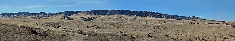 The Horseshoe Hills are a roughly crescent-shaped range of hills north of Manhattan, Montana in Gallatin County, Montana. They lie at 6,673 feet (2,034 m)[1] in the area between the southern Big Belt Mountains and the northern Bridger Range. The hills are bounded on the north by Sixteen Mile Creek (which begins in the Crazy Mountains), the first major tributary of the Missouri River. As they are in the rain shadow of the Boulder, Elkhorn, and Bull Mountains to the west, the Horseshoe Hills are notably dry, receiving 10–12 inches (250–300 mm) of precipitation annually. This is especially true on the southern and southeastern flanks, which are also in the rain shadow of the hills themselves. In the driest areas, Missouri foxtail cacti, plains prickly pear cacti, and yucca abound, as well as prairie rattlesnakes. Much of the hills are private property, but there is also some state, BLM, and National Forest land.