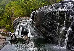 World's End is a sheer cliff with a 870 m (2,850 ft) drop.[6] Baker's Falls, a waterfall formed by Belihul Oya, a tributary of the Walawe River is named after Sir Samuel Baker.[7] The waterfall is 20 m (66 ft) high, and Slab Rock Falls is another well-known waterfall in the plains.[6]