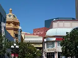 Horton Plaza was a five-level outdoor shopping mall in downtown San Diego, California. It was designed by Jon Jerde and was known for its bright colors, architectural tricks, and odd spatial rhythms, occupying 6.5 city blocks adjacent to the city's historic Gaslamp Quarter. Opening in 1985, it was the first successful downtown retail center since the rise of suburban shopping centers decades earlier.[2]