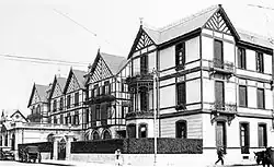 The first building of the Bristol Hotel, the casa vieja ("old house") of 1888, was a three-story building 45 by 28 metres (148 by 92 ft) in area with 67 rooms, built in Mock-Tudor style on the block between Entre Ríos, Corrientes, San Martín and Rivadavia. The ground floor was of masonry and the upper floors of wood frame with brick panels. The roof, with several gables, was of slate. It had two square towers with pyramidal roofs. Other mansions with the same design were built along Rivadavia in 1904 and San Martín in 1908. The group of buildings was connected through gardens and paths.[2]