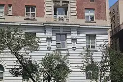 The design of the base along 103rd Street is similar to on Broadway, except that the ground slopes up from east to west, and there is a recessed areaway in front of the ground story.[16] There is an iron fence in front of the areaway, which was replaced at some point in the 20th century.[17] The original main entrance to the building is in the central bay on 103rd Street, on the second story,[16] through an arch measuring 15 feet (4.6 m) tall.[18] The entrance is flanked by Tuscan-style fluted columns with bands, and there is an ornate entablature above the columns. In addition, a cartouche with mask and swag motifs is placed above the entrance. The bays directly next to the entrance are arched and contain rectangular panes with an oculus above them. On the third through seventh stories, the window in the central bay is flanked by slit windows. The upper stories are similar in design to the Broadway facade.[16]