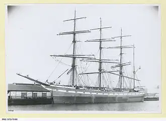 In 1910 nine men were washed overboard when a rogue wave hit her stern in a hurricane. Five of the men were washed back on board by the next wave, but the remaining four were never seen again. In November 1927 her rig sustained damage in the Bay of Biscay, and she took refuge at the port of Lisbon, Portugal, where she was repaired in order to continue her voyage to Melbourne, Australia. In 1931 several of her sails were torn to shreds in a storm near Cape Horn.[3]