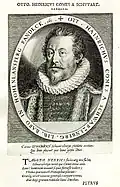 In 1599, Adolf von Schwarzenberg became an Imperial Count, and was given by the emperor a quarter with a canting arms showing the head of a Turk being pecked by a raven. This was to commemorate Adolf's conquest on 19 March 1598 of the Turkish-held fortress and city Győr. The German name of the Hungarian town is Raab, which means raven.[5][6][7]