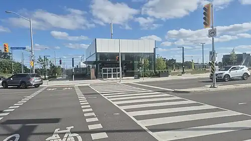 The station will be located below street level in an open trench running parallel to Highway 27. The station will have two street-level entrances, one entrance on the south side of Humber College Boulevard, the second further south facing a new street that will intersect with Highway 27.[1] The entrance structures will be at least 7.5 m (25 ft) in height, and will each face a plaza.[7]: 17 The centre platform will have several canopies for weather protection. The lack of a roof over the trench will allow natural lighting on the platform.[8]: 9 An exterior walkway with a 200-metre (660 ft) canopy will link the station to the Humber Polytechnic campus.[4][5] The station will have a bike room to accommodate 40 bicycles, two elevators for accessibility,[9] Wi-Fi and washrooms.[8]: 11