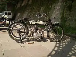 Humber launched their all new 3.5HP belt-driven motorcycle at the Stanley Show in 1908.[6] This had an upright single-cylinder side-valve engine of 83mm bore and 90mm stroke (487cc), with mechanically operated valves, and Bosch magneto ignition. A 2-speed hub gear (Roc patent) was optional. Humber offered Roc patent epicyclic gears up to c1910, and were reported to have been involved in the development of the Wall Auto-Wheel for the holder of the ROC patents (Arthur Wall).