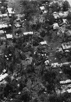 The Red Cross provided food and shelter to 63,000 people in the hurricane's wake, costing about $166 million (1983 USD; $524 million 2025 USD).[1][24] FEMA gave out $32 million (1983 USD; $101 million 2025 USD) to Alicia's victims and local governments; $23 million (1983 USD; $72.6 million 2025 USD) of that was for picking up debris spread after the storm.[25] More than 16,000 people sought help from FEMA's disaster service centers. The Small Business Administration, aided with 56 volunteers, interviewed over 16,000 victims, and it was predicted that about 7,000 loan applications would be submitted. The Federal Insurance Agency had closed over 1,318 flood insurance cases from Alicia's aftermath, however only 782 received final payment.[25]