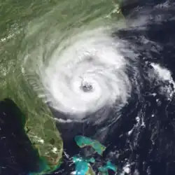 Tracking west-northwestward in advance of a trough over the eastern United States, the system did not resemble a typical hurricane on satellite imagery, with a low-level center outside of the deepest convection.[3] The system turned towards the northwest and simultaneously slowed in motion by August 27 as a second mid-latitude trough passed to its north. Though wind shear remained unfavorable initially, it began to lessen on August 28 as an anticyclone developed aloft. At 12:00 UTC, Dennis was upgraded to a Category 2 hurricane on the Saffir–Simpson scale and reached peak winds of 105 mph (165 km/h), though its lowest barometric pressure was recorded until 06:00 UTC on August 30. Despite this intensity, the hurricane's eye was large, up to 30-40 mi (50–65 km) wide, and several fixes from the Hurricane Hunters did not indicate the presence of one at all. The system also became unusually large, with its radius of maximum sustained winds extending up to 70-85 mi (110–130 km) wide. Following peak intensity, Dennis accelerated towards the northeastward in response to the secondary trough, barely missing the Outer Banks. By August 31, steering currents collapsed and the hurricane began to aimlessly drift east of Cape Hatteras, North Carolina.[2]