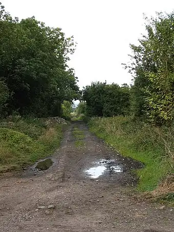 ![]() Old railway track at Husthwaite Gate looking east; the row of bricks indicates the edge of the platform, September 2007 | |||||