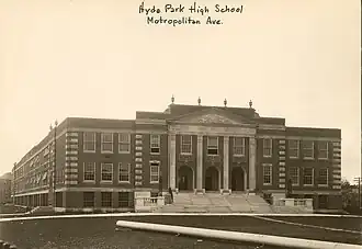 Hyde Park High School was established in 1869, in what was then the independent town of Hyde Park, Massachusetts.[3] In its early years, the school offered two courses of study for pupils, a four year classical preparatory education, and a two year business training course.[4] Hyde Park was annexed by the City of Boston in 1912, and the administration of Hyde Park High School was assumed by Boston Public Schools (BPS). Male and female pupils were taught separately until senior year, at which time the studies became co-educational.[5] Into the 1960s, the school was a popular choice for parents and students, even for those outside of the neighborhood, evidenced by the population increase at the school from 1,236 pupils enrolled in 1960 to 1,700 students in 1967. The headmaster reported a waiting list of 250 at that time.[1]