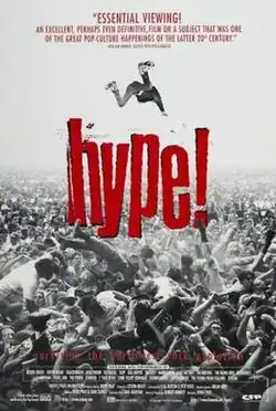 Hype! (1996) is a documentary directed by Doug Pray about the popularity of grunge rock in the early to mid-1990s United States. It incorporates interviews and rare concert footage to trace the development of the grunge scene from its early beginning in neighborhood basements to its emergence as an explosive pop culture phenomenon. Hype! attempts to dispel some of the myths of the genre promulgated by media hype by depicting the grunge subculture from the point of view of people who were active in the scene. The film generally portrays this mythos in a satirical way while acknowledging that it was media hype that helped propel some of these obscure bands to fame.