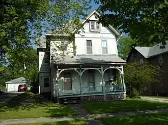 The house is a simplified version of the Queen Anne style known as the Shingle Style. This structure is also an example of a "pinwheel" house.[3] It is a two-story square box, with a pointed hipped roof, and gabled projections that are asymmetrically placed at the front and on the sides of the structure.[3] The house also features an Eastlake porch, a variety of surface textures and stained glass transom lights.