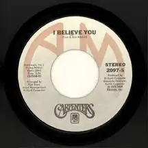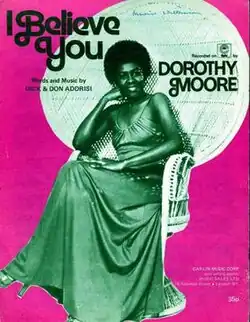 "I Believe You" is a love ballad composed by Don and Dick Addrisi which was a 1977 single for Dorothy Moore; taken from her self-titled Dorothy Moore album. "I Believe You" reached #5 R&B and crossed over to the US Pop Top 30 at number 27.[2] The track also reached number 20 in the UK.[3]