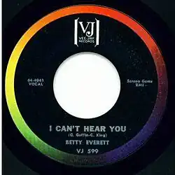 The Betty Everett version was released in the summer of 1964 as the follow-up to her top ten song "The Shoop Shoop Song". Robert Pruter in his book Chicago Soul describes "I Can't Hear You" as a "surprisingly weak [song] for Goffin-King that did not give the Vee Jay [Records] staff [musicians] much to work with" and dismisses Everett's single with its number 39 R&B chart (as reported in Cash Box magazine) as "essentially a non-hit."[2] "I Can't Hear You" appeared on the Billboard Hot 100 with a peak of number 66,[3] and number 85 on the Cash Box Pop 100.
