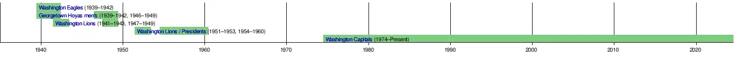 Due to its modest winters, ice hockey was a relative unknown in D.C. until the opening of Riverside Stadium in 1938. While it was not primarily an ice rink the multi-purpose arena could be flooded for that purpose. That enabled Georgetown to found a varsity ice hockey team the following season.[2] 1939 also saw the city get its first professional team when the Washington Eagles joined the Eastern Hockey League. Two years later the Uline Arena was completed and the new building served as the home for the Washington Lions. Competition between the Eagles and Lions was fierce in 1942 but eventually the new club won out and the Eagles folded. Compounding problems was the entry of the US into World War II and that caused both the Hoyas and the Lions to suspend operations for the duration.[3]
