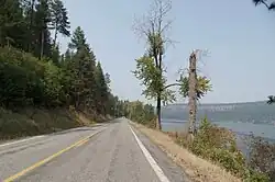 SH-5 begins at an intersection with US 95 in Plummer and heads east through Heyburn State Park, running along the south shore of Chatcolet Lake and Benewah Lake to Parkline. It then continues east past a historical marker for John Mullan into Saint Maries and onto the Coeur d'Alene Indian Reservation within the city, where it ends at an intersection with SH-3.[1][2]