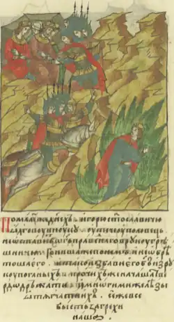 The son of Sviatoslav Olgovich, prince of Chernigov, in 1169 Igor took part in the war against Mstislav Iziaslavich of Kiev on the side of Andrey Bogolyubsky. In order to counter Cuman raids on the lands of southern Rus', in 1185 he organized a campaign against the nomads, without the knowledge of the Grand Prince of Kiev. After an initial victory, Igor's army was surrounded on the Kaiala River. The prince himself was captured, but managed to escape. After Igor's defeat, the Cumans raided the Principality of Pereyaslavl.[6]