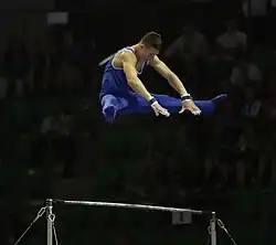 Kovtun competed at the World Cups in Cairo, Cottbus, and Baku; he won gold on the parallel bars at each competition.[33][34][35] He next competed at the Osijek Challenge Cup where he won gold on floor exercise and silver on parallel bars behind Lukas Dauser.[36] In late April Kovtun competed at the European Championships alongside Nazar Chepurnyi, Igor Radivilov, Radomyr Stelmakh, and Oleg Verniaiev; together they qualified to the team final in first place and individually Kovtun qualified to the parallel bars and horizontal bars finals. Additionally Kovtun finished sixth in the all-around. During event finals Kovtun won gold on both apparatuses.[37] During the team final Kovtun contributed scores on pommel horse, rings, parallel bars, and horizontal bar towards Ukraine's first place finish.[38]