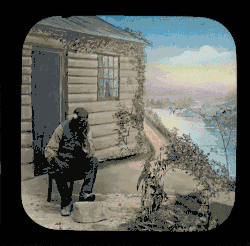 Many magic lantern slides featured "dissolving view" effects, like this pair from "The Little Old Log Cabin in the Lane"