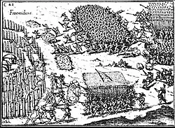 Two engravings from 1599 illustrating explorer Ulrich Schmidl's chronicles of 1534–1554 in the Río de la Plata basin, depicting the indigenous Cario people[note 2] (top) and a battle between them and Spanish colonists (bottom).