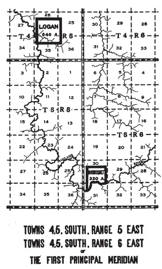 In 1786, during Logan's Raid, General Benjamin Logan of Kentucky took a number of hostages, including a Shawnee youngster named Spemica Lawba, who came to be known as Captain Logan. He was later exchanged and returned to his own people, and became a chief. He scouted for the Americans in the War of 1812 and died after a skirmish.[5] The Treaty of Fort Meigs granted Captain Logan's surviving children 640 acres on the east side of the Auglaize River, T4S R5E of the First Principal Meridian, in Auglaize County, Ohio.[6]