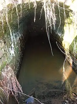 Ladyha No 2 pit was sunk in 1885 to a depth of 568 feet (173 m) and closed in May 1934, having struggled since its main customer, the Eglinton Iron Company, closed in 1928. A fairly substantial brick-lined tunnel still survives which once carried a standard gauge railway line unobtrusively to Ladyha colliery, out of the Earl's sight and the smoke kept away from the kitchen gardens' greenhouses and plants.[38] Other such cosmetic tunnels exist at Alloway and near Culzean Castle.[39] The tunnel was used during World War II as a bomb shelter and storage area for furniture; it remains in good condition. The old colliery ruins were razed to the ground in 2011, having been assessed as a danger to the public.